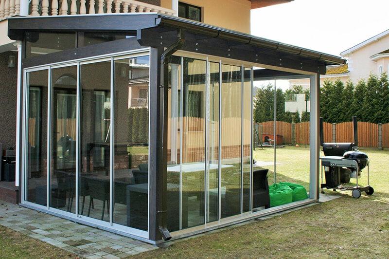 При остеклении террасы и беседки часто используются алюминиевые рамы. Небольшой вес практически не утяжеляет конструкцию, что хорошо при установке на балконе. Раздвижные окна оптимальны при использовании в беседках на террасах. Не загромождают пространство при открытии, в отличие от распашных. Монтируются в больших проемах, в маленьких с передвижением створки по стене. Стоимость рассчитывается в зависимости от площади остекляемой поверхности. За один метр квадратный от 3610 рублей на террасы и от 2630 рублей на балконы.
