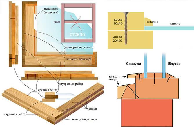 Каждая строительно-монтажная работа состоит из 3 стадий: подготовки, создания и завершения рабочего процесса. Для сборки окна выбирают наиболее приемлемое сырье и подготавливают столярный инструмент. Деревянные окна своими руками изготавливают, руководствуясь схемой. В подробном чертеже указывают общие размеры рамы и величину каждой отдельной детали.