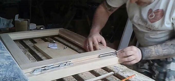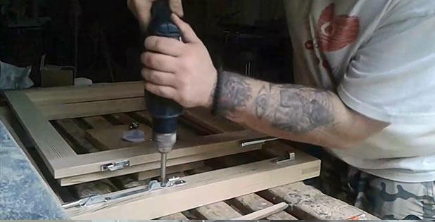 Петли из пластика и дерева устанавливают на легкие небольшие конструкции. Для более тяжелых моделей используют металлические. Чтобы установить петли, внизу и вверху оконной рамы и в створке просверливают отверстие. Петли монтируют на раму, выравнивают по оси и закрепляют. Створку окна ставят на готовые петли. При изготовлении деревянного профиля для окон своими руками в раме проделывают отверстия для установки ручки. В него вставляют изделие и прикручивают винтами.