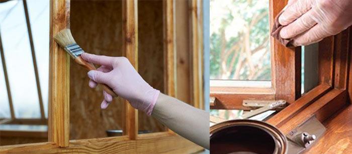 Внешние факторы, такие как сырость, насекомые и солнечный свет, сильно влияют на деревянные окна. Чтобы увеличить срок эксплуатации, окна обрабатывают герметиком, покрывают лаком или красят. Обработка состоит из 4 этапов: