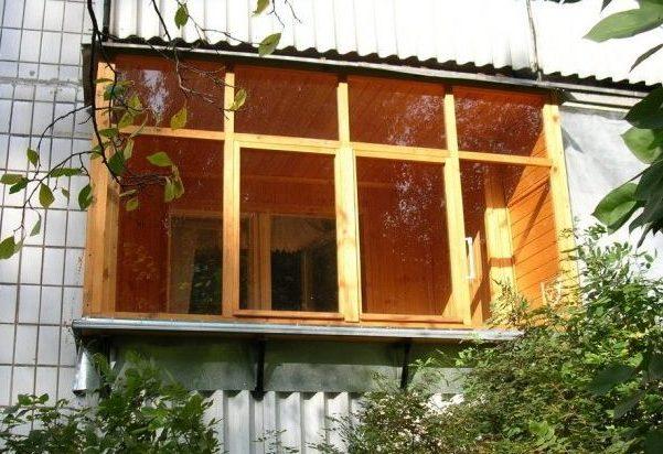 Остекление балкона деревом — дешевый метод ремонта при использовании бюджетных сортов (сосна, ель, осина). Материал экологически чистый, способствует созданию благоприятного микроклимата в помещении, ремонтопригоден. Долговечность сырью обеспечат специальные пропитки. Преимуществами деревянных окон являются эстетичная фактура, возможность придавать поверхностям требуемый оттенок лаками и красками. Скорость работ по монтажу рам из дерева небольшая. Пористая структура обеспечивает воздухопроницаемость материалу.