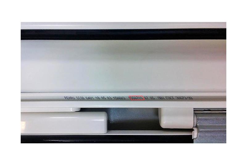 Буквенно-цифровую маркировку можно увидеть, если убрать штапик в глухой створке или в фальце створки при извлечении стеклопакета. Последовательно сюда записывают: название компании, код модели профиля, дату производства, с указанием смены и партии изделий, артикул (начинается с 5 или 15), материал профиля, ГОСТ. Шероховатая поверхность профиля с наплывами, трещинами, царапинами, неравномерным прокрасом и пятнами должна вас насторожить.