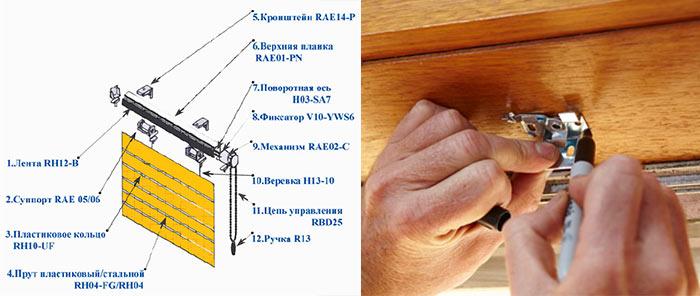 Если дырки под кронштейны сверлятся в старых стенах, хватит и простой дрели. Для бетонных конструкций потребуется перфоратор. Сначала закрепляется кронштейн. Затем с одной стороны прикручивают держатель, вставляют в него вал. Потом закрепляют уже одетый держатель с другой стороны. Механизм закрывают декоративными пластинами.