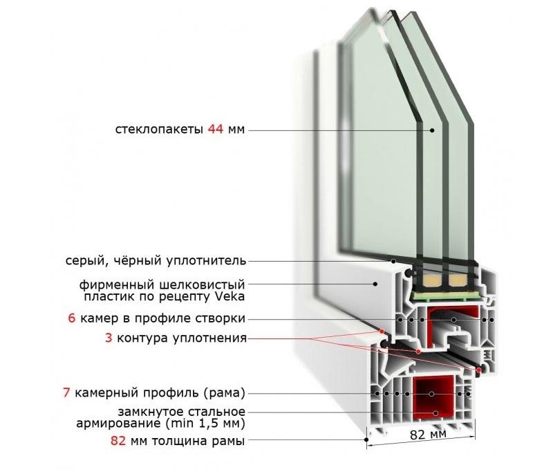 Окна VEKA Softline за счёт усилителя замкнутого сечения увеличивает сопротивляемость к статическим нагрузкам и деформации. Армированный неподвижный профиль из 7 воздушных камер (створки из 6 камер) повышает коэффициент теплопередачи до 1,06 м2°С/Вт,э. Теплоизоляция таких окон на 33% выше, чем аналогичной рамы 70 мм.
