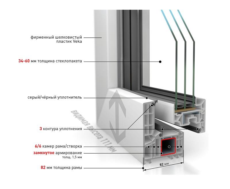 Возможно выполнение створок со смещением и совмещённые конструкции с распашной, раздвижной и складной системой открывания дверей «гармошкой». Армирование профиля VEKA выполнено по стандарту компании-изготовителя. Умные окна комплектуются со стеклопакетом от 24 до 52 мм при монтажной глубине 82 мм. Высота фальца 25 мм исключает образование конденсата на стеклопакетах.